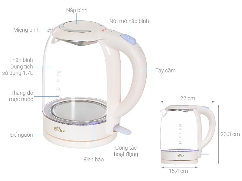- Dung tích 1.7 lít tích hợp cột hiển thị mực nước trên thân bình.