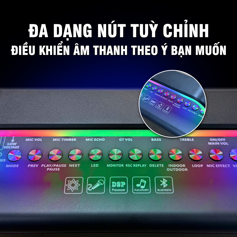 - Chức năng chính: Bluetooth / USB / TF Card / Cổng AUX / OTG Digital Audio Live Streaming / Đèn LED RGB / Kèm