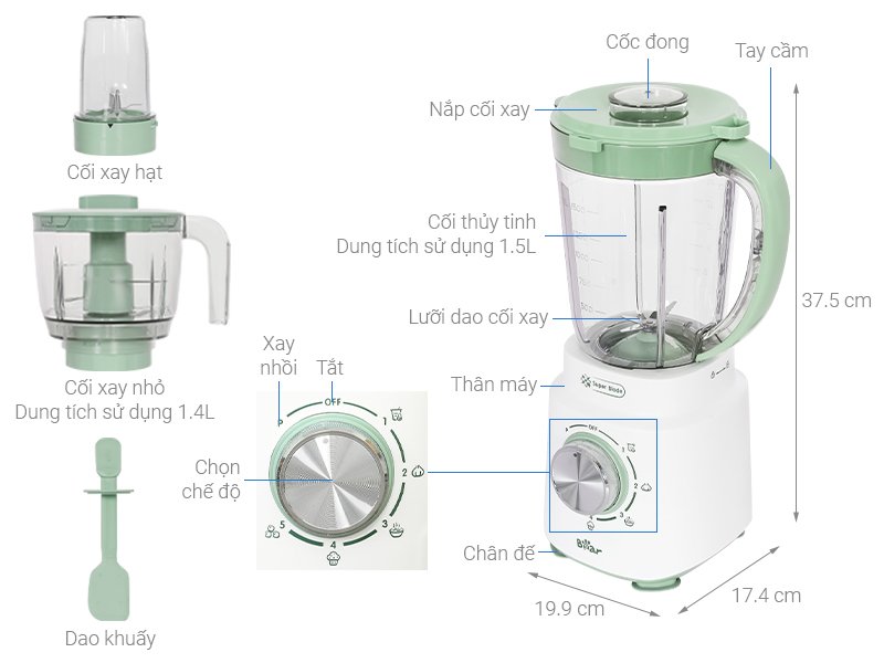 - Thiết kế tiện lợi với đũa khuấy nguyên liệu lớn, nắp nhỏ thêm nguyên liệu khi xay và các bộ phận tháo rời dễ vệ sinh.